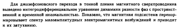 Для джозефсоновского перехода в тонкой пленке магнитного сверхпроводника выведено интегродифференциальное уравнение динамики разности фаз с пространственной и временной нелокальностью. Показано, что магнитная подсистема перенор-мировывает спектр малоамплитудных электромагнитных возбуждений и приводит к их затуханию.