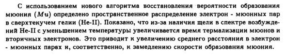 С использованием нового алгоритма восстановления вероятности образования мюония (Ми) определено пространственное распределение электрон мюонных пар в сверхтекучем гелии (Не-П). Показано, что из-за наличия щели в спектре возбуждений Не-11 с уменьшением температуры увеличивается время термализации мюонов и вторичных электронов. Это приводит к увеличению среднего расстояния в электрон мюонных парах и, соответственно, к замедлению скорости образования мюония.