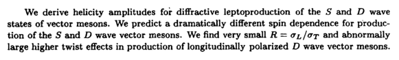 We derive helicity amplitudes for diffractive leptoproduction of the S and D wave states of vector mesons. We predict a dramatically different spin dependence for production of the S and D wave vector mesons. We find very small R — σ^/σχ and abnormally large higher twist effects in production of longitudinally polarized D wave vector mesons.