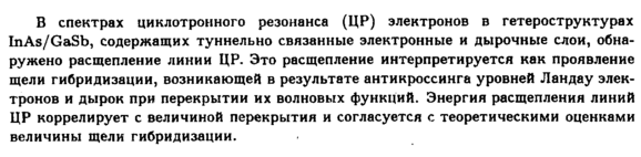 В спектрах циклотронного резонанса (ЦР) электронов в гетероструктурах InAs/GaSb, содержащих туннельно связанные электронные и дырочные слои, обнаружено расщепление линии ЦР. Это расщепление интерпретируется как проявление щели гибридизации, возникающей в результате антикроссинга уровней Ландау электронов и дырок при перекрытии их волновых функций. Энергия расщепления линий ЦР коррелирует с величиной перекрытия и согласуется с теоретическими оценками величины щели гибридизации.