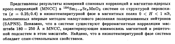Представлены результаты измерений спиновых корреляций и магнитно-ядерных кросс-корреляций (MNCC) в 1B4Smi_xSra;Mn03 системе со структурой перовски-та (х — 0.25; 0.4) в низкотемпературной фазе в магнитных полях 0 < Η < 1 кЭ, выполненных впервые методом малоуглового рассеяния поляризованных нейтронов (SAPNS). Показано, что в системе существуют ферромагнитные корреляции масштаба 180 — 250 А и MNCC, характеризующие взаимосвязь магнитной и решеточной подсистем в этом масштабе. Найдено, что в низкотемпературной фазе система обладает спин-стекольными свойствами.