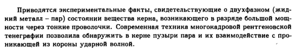 Приводятся экспериментальные факты, свидетельствующие о двухфазном (жидкий металл пар) состоянии вещества керна, возникающего в разряде большой мощности через тонкие проволочки. Современная техника многокадровой рентгеновской тенеграфии позволила обнаружить в керне пузыри пара и их взаимодействие с проникающей из короны ударной волной.