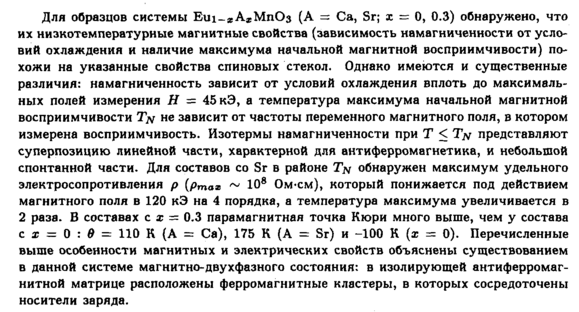 Для образцов системы Еи1_хА„МпОз (А = Са, Sr; χ = 0, 0.3) обнаружено, что их низкотемпературные магнитные свойства (зависимость намагниченности от условий охлаждения и наличие максимума начальной магнитной восприимчивости) похожи на указанные свойства спиновых стекол. Однако имеются и существенные различия: намагниченность зависит от условий охлаждения вплоть до максимальных полей измерения Я = 45 кЭ, а температура максимума начальной магнитной восприимчивости Tjv не зависит от частоты переменного магнитного поля, в котором измерена восприимчивость. Изотермы намагниченности при Τ < Ту представляют суперпозицию линейной части, характерной для антиферромагнетика, и небольшой спонтанной части. Для составов со Sr в районе Tjv обнаружен максимум удельного электросопротивления ρ (ртах ~ Ю8 Ом-см), который понижается под действием магнитного поля в 120 кЭ на 4 порядка, а температура максимума увеличивается в 2 раза. В составах с χ — 0.3 парамагнитная точка Кюри много выше, чем у состава с χ = 0 : θ = 110 К (А = Са), 175 К (А = Sr) и -100 К (х = 0). Перечисленные выше особенности магнитных и электрических свойств объяснены существованием в данной системе магнитно-двухфазного состояния: в изолирующей антиферромагнитной матрице расположены ферромагнитные кластеры, в которых сосредоточены носители заряда.