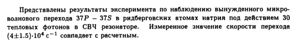 Представлены результаты эксперимента по наблюдению вынужденного микроволнового перехода 37Р 37S в ридберговских атомах натрия под действием 30 тепловых фотонов в СВЧ резонаторе. Измеренное значение скорости перехода (4±1.5)·104 с-1 совпадает с расчетным.
