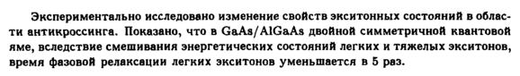 Экспериментально исследовано изменение свойств экситонных состояний в области антикроссинга. Показано, что в GaAs/AlGaAs двойной симметричной квантовой яме, вследствие смешивания энергетических состояний легких и тяжелых экситонов, время фазовой релаксации легких экситонов уменьшается в 5 раз.