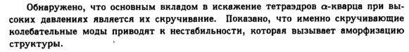 Обнаружено, что основным вкладом в искажение тетраэдров α-кварца при высоких давлениях является их скручивание. Показано, что именно скручивающие колебательные моды приводят к нестабильности, которая вызывает аморфизацию структуры.