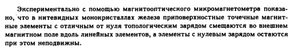 Экспериментально с помощью магнитооптического микромагнетометра показано, что в нитевидных монокристаллах железа приповерхностные точечные магнитные элементы с отличным от нуля топологическим зарядом смещаются во внешнем магнитном поле вдоль линейных элементов, а элементы с нулевым зарядом остаются при этом неподвижны.