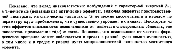 Показано, что вклад низкочастотных возбуждений с характерной энергией fuvi в Т-нечетные (невзаимные) оптические эффекты, включая эффекты пространственной дисперсии, на оптических частотах ω ^ ωχ можно рассчитывать в нулевом по параметру ωι/ω приближении, что существенно упрощает их анализ. Некоторые из этих эффектов оказываются независящими от частоты в спектральных областях, где показатель преломления η(ω) fa const. Показано, что независящее от частоты фара-деевское вращение может наблюдаться в средах с равной нулю намагниченностью, в том числе и в средах с равной нулю микроскопической плотностью магнитного момента.