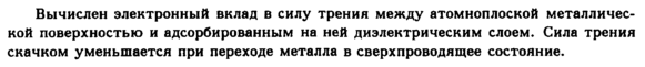 Вычислен электронный вклад в силу трения между атомноплоской металлической поверхностью и адсорбированным на ней диэлектрическим слоем. Сила трения скачком уменьшается при переходе металла в сверхпроводящее состояние.