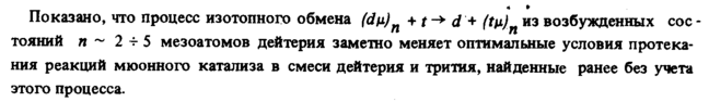 * * Показано, что процесс изотопного обмена (άμ)η +t^>d + (ίμ) из возбужденных сое -тояний η ~ 2 -г 5 мезоатомов дейтерия заметно меняет оптимальные условия протекания реакций мюонного катализа в смеси дейтерия и трития, найденные ранее без учета этого процесса.