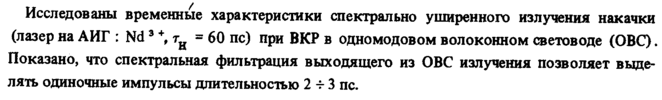 Исследованы временные характеристики спектрально уширенного излучения накачки (лазер на АИГ : Nd 3 + тн = 60 пс) при ВКР в одномодовом волоконном световоде (ОВС). Показано, что спектральная фильтрация выходящего из ОВС излучения позволяет выделять одиночные импульсы длительностью 2 -г 3 пс.