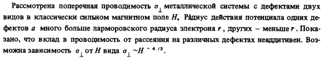 Рассмотрена поперечная проводимость σχ металлической системы с дефектами двух видов в классически сильном магнитном поле Я. Радиус действия потенциала одних дефектов а много больше ларморовского радиуса электрона г, других — меньше г. Показано, что вклад в проводимость от рассеяния на различных дефектах неаддитивен. Возможна зависимость σ. от Я вида σ. ~Н ' 4 /3.