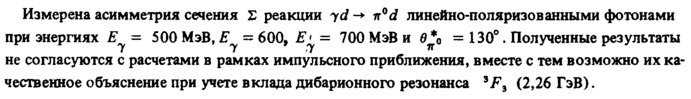 Измерена асимметрия сечения Σ реакции yd-* n°d линейно-поляризованными фотонами при энергиях Е^ = 500 МэВ, = 600, Е^ = 700 МэВ и flff*fl = 130°. Полученные результаты не согласуются с расчетами в рамках импульсного приближения, вместе с тем возможно их качественное объяснение при учете вклада дибарионного резонанса 3ЕЪ (2,26 ГэВ).