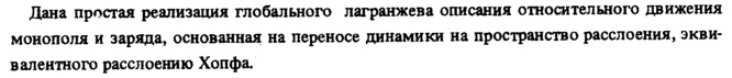 Дана простая реализация глобального лагранжева описания относительного движения монополя и заряда, основанная на переносе динамики на пространство расслоения, эквивалентного расслоению Хопфа.
