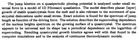 The jump kinetics on a quasiperiodic pinning potential is analyzed under small external force in a model of ID Fibonacci quasilattice. The model describes planar (layer) growth of stable quasicrystals from the melt and is also relevant to the movement of qua-sicrystal dislocations under small stress. Exact solution is found for the spectrum of jump length as function of the driving force. The solution describes the supercooling dependence of the nucleus heights spectrum on the growing surface of a quasicrystal. The spectrum appears to be universal and its shape has a periodical dependence on the logarithm of supercooling. Resulting quasicrystal growth kinetics agrees well with that found in the computer simulations and in the analysis of continuous thermodynamic models.