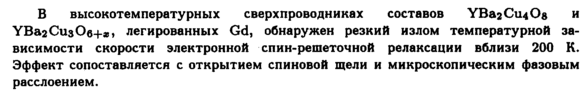 В высокотемпературных сверхпроводниках составов УВагС^Ов и УВагСизОе+а», легированных Gd, обнаружен резкий излом температурной зависимости скорости электронной спин-решеточной релаксации вблизи 200 К. Эффект сопоставляется с открытием спиновой щели и микроскопическим фазовым расслоением.