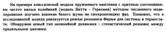 На примере классической модели пружинного маятника с кратным соотношением частот малых колебаний (модель Витта Горелика) методом численного моделирования изучено влияние белого шума на синхронизацию фаз. Показано, что в исследованной модели реализуется режим резонанса Ферми для системы в термостате. Обнаружен новый тип нелинейной динамики стохастический резонанс между предельными циклами.
