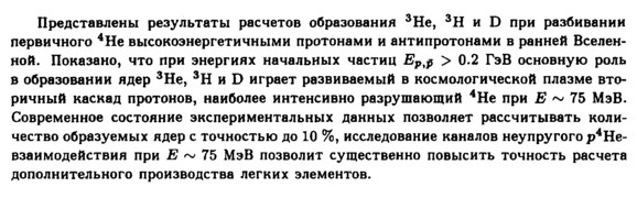 Представлены результаты расчетов образования 3Не, 3Н и D при разбивании первичного 4Не высокоэнергетичными протонами и антипротонами в ранней Вселенной. Показано, что при энергиях начальных частиц EPtp > 0.2 ГэВ основную роль в образовании ядер 3Не, 3Н и D играет развиваемый в космологической плазме вторичный каскад протонов, наиболее интенсивно разрушающий 4Не при Ε ~ 75 МэВ. Современное состояние экспериментальных данных позволяет рассчитывать количество образуемых ядер с точностью до 10 %, исследование каналов неупругого р4Не-взаимодействия при Ε ~ 75 МэВ позволит существенно повысить точность расчета дополнительного производства легких элементов.
