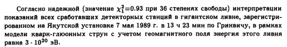 Согласно надежной (значение χξ=0.93 при 36 степенях свободы) интерпретации показаний всех сработавших детекторных станций в гигантском ливне, зарегистрированном на Якутской установке 7 мая 1989 г. в 13 ч 23 мин по Гринвичу, в рамках модели кварк-глюонных струн с учетом геомагнитного поля энергия этого ливня равна 3· 1020 эВ.