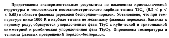 Представлены экспериментальные результаты по изменению кристаллической структуры и теплоемкости нестехиометрического карбида титана TiCv (0.5 < у < < 0.65) в области фазовых переходов беспорядок-порядок. Установлено, что при температуре ниже 1000 К в карбиде титана по механизму фазовых переходов, близких к первому роду, образуются упорядоченные фазы Т12С с кубической и тригональной симметрией и ромбическая упорядоченная фаза Т13С2. Определены температуры и теплоты фазовых превращений порядок-беспорядок.