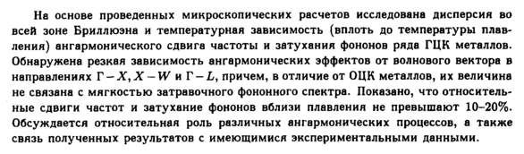 На основе проведенных микроскопических расчетов исследована дисперсия во всей зоне Бриллюэна и температурная зависимость (вплоть до температуры плавления) ангармонического сдвига частоты и затухания фононов ряда ГЦК металлов. Обнаружена резкая зависимость ангармонических эффектов от волнового вектора в направлениях Г — Х,Х — W и Г — L, причем, в отличие от ОЦК металлов, их величина не связана с мягкостью затравочного фононного спектра. Показано, что относительные сдвиги частот и затухание фононов вблизи плавления не превышают 10-20%. Обсуждается относительная роль различных ангармонических процессов, а также связь полученных результатов с имеющимися экспериментальными данными.