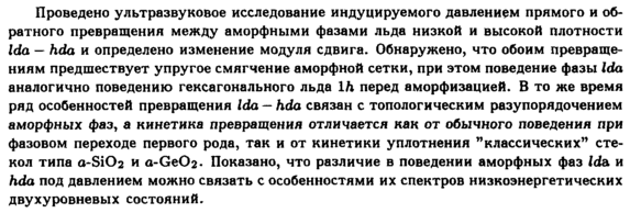 Проведено ультразвуковое исследование индуцируемого давлением прямого и обратного превращения между аморфными фазами льда низкой и высокой плотности Ida — hda и определено изменение модуля сдвига. Обнаружено, что обоим превращениям предшествует упругое смягчение аморфной сетки, при этом поведение фазы Ida аналогично поведению гексагонального льда lh перед аморфизацией. В то же время ряд особенностей превращения Ida — hda связан с топологическим разупорядочением аморфных фаз, а кинетика превращения отличается как от обычного поведения при фазовом переходе первого рода, так и от кинетики уплотнения "классических" стекол типа 0-S1O2 и a-GeChПоказано, что различие в поведении аморфных фаз Ida и hda под давлением можно связать с особенностями их спектров низкоэнергетических двухуровневых состояний.