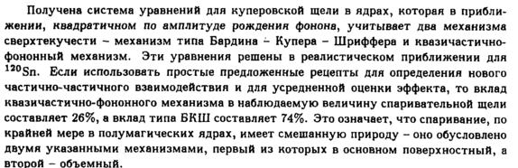 Получена система уравнений для куперовской щели в ядрах, которая в приближении, квадратичном по амплитуде рождения фонона, учитывает два механизма сверхтекучести механизм типа Бардина Купера Шриффера и квазичастично-фононный механизм. Эти уравнения решены в реалистическом приближении для 120Sn. Если использовать простые предложенные рецепты для определения нового частично-частичного взаимодействия и для усредненной оценки эффекта, то вклад квазичастично-фононного механизма в наблюдаемую величину спаривательной щели составляет 26%, а вклад типа БКШ составляет 74%. Это означает, что спаривание, по крайней мере в полумагических ядрах, имеет смешанную природу оно обусловлено двумя указанными механизмами, первый из которых в основном поверхностный, а второй объемный.