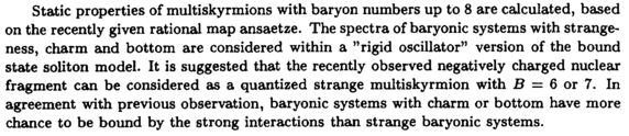 Static properties of multiskyrmions with baryon numbers up to 8 are calculated, based on the recently given rational map ansaetze. The spectra of baryonic systems with strangeness, charm and bottom are considered within a "rigid oscillator" version of the bound state soliton model. It is suggested that the recently observed negatively charged nuclear fragment can be considered as a quantized strange multiskyrmion with В = 6 or 7. In agreement with previous observation, baryonic systems with charm or bottom have more chance to be bound by the strong interactions than strange baryonic systems.