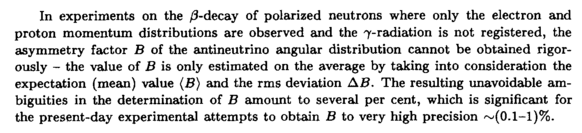 In experiments on the /З-decay of polarized neutrons where only the electron and proton momentum distributions are observed and the 7-radiation is not registered, the asymmetry factor В of the antineutrino angular distribution cannot be obtained rigorously the value of В is only estimated on the average by taking into consideration the expectation (mean) value (B) and the rms deviation AB. The resulting unavoidable ambiguities in the determination of В amount to several per cent, which is significant for the present-day experimental attempts to obtain В to very high precision ~(0.1-1)%.
