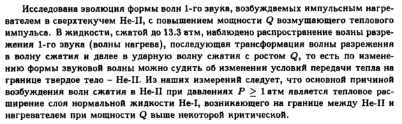 Исследована эволюция формы волн 1-го звука, возбуждаемых импульсным нагревателем в сверхтекучем Не-И, с повышением мощности Q возмущающего теплового импульса. В жидкости, сжатой до 13.3 атм, наблюдено распространение волны разрежения 1-го звука (волны нагрева), последующая трансформация волны разрежения в волну сжатия и далее в ударную волну сжатия с ростом Q, то есть по изменению формы звуковой волны можно судить об изменении условий передачи тепла на границе твердое тело Не-Н. Из наших измерений следует, что основной причиной возбуждения волн сжатия в Не-И при давлениях Ρ > 1 атм является тепловое расширение слоя нормальной жидкости Не-I, возникающего на границе между Не-П и нагревателем при мощности Q выше некоторой критической.