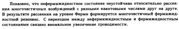 Показано, что нефермижидкостное состояние неустойчиво относительно рассеяния многочастичных возбуждений с разными квантовыми числами друг на друге. В результате рассеяния на уровне Ферми формируется многочастичный фермижид-костной резонанс. С переходом между нефермижидкостным и фермижидкостным состояниями связано аномальное увеличение проводимости.