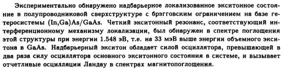 Экспериментально обнаружено надбарьерное локализованное экситонное состояние в полупроводниковой сверхструктуре с брэгговским ограничением на базе ге-теросистемы (In,Ga)As/GaAs. Четкий экситонный резонанс, соответствующий интерференционному механизму локализации, был обнаружен в спектре поглощения этой структуры при энергии 1.548 эВ, т.е. на 33 мэВ выше энергии объемного экси-тона в GaAs. Надбарьерный экситон обладает силой осциллятора, превышающей в два раза силу осциллятора основного экситонного состояния в системе, и вызывает отчетливые осцилляции Ландау в спектрах магнитопоглощения.
