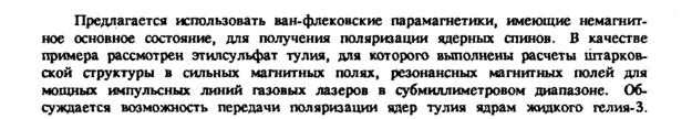 Предлагается использовать ван-флековские парамагнетики, имеющие немагнитное основное состояние, для получения поляризации ядерных спинов. В качестве примера рассмотрен этил сульфат тулия, для которого выполнены расчеты штарков-ской структуры в сильных магнитных полях, резонансных магнитных полей для мощных импульсных линий газовых лазеров в субмиллиметровом диапазоне. Обсуждается возможность передачи поляризации ядер тулия ядрам жидкого гелия-3.