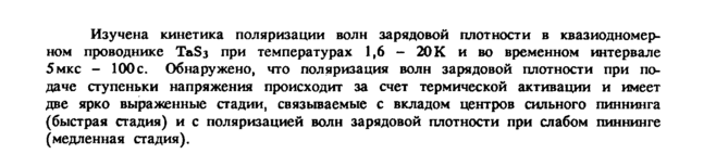Изучена кинетика поляризации волн зарядовой плотности в квазиодномерном проводнике ТаЭз при температурах 1,6 20 К и во временном интервале 5мкс 100с. Обнаружено, что поляризация волн зарядовой плотности при подаче ступеньки напряжения происходит за счет термической активации и имеет две ярко выраженные стадии, связываемые с вкладом центров сильного пиннинга (быстрая стадия) и с поляризацией волн зарядовой плотности при слабом пиннинге (медленная стадия).
