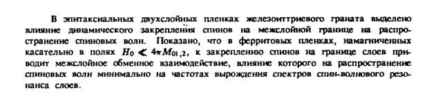 В элитаксиальных двухслойных пленках железоиттриевого граната выделено влияние динамического закрепления спинов на межслойной границе на распространение спиновых волн. Показано, что в ферритовых пленках, намагниченных касательно в полях Но <С 4кМо\ ,2, к закреплению спинов на границе слоев приводит межслойное обменное взаимодействие, влияние которого на распространение спиновых волн минимально на частотах вырождения спектров спин-волнового резонанса слоев.