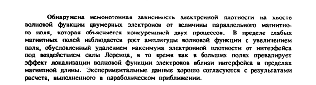 Обнаружена немонотонная зависимость электронной плотности на хвосте волновой функции двумерных электронов от величины параллельного магнитного поля, которая объясняется конкуренцией двух процессов. В пределе слабых магнитных полей наблюдается рост амплитуды волновой функции с увеличением поля, обусловленный удалением максимума электронной плотности от интерфейса под воздействием силы Лоренца, в то время как в больших полях превалирует эффект локализации волновой функции электронов вблизи интерфейса в пределах магнитной длины. Экспериментальные данные хорошо согласуются с результатами расчета, выполненного в параболическом приближении.