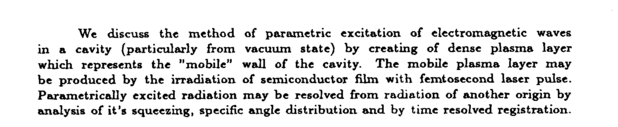 We discuss the method of parametric excitation of electromagnetic waves in a cavity (particularly from vacuum state) by creating of dense plasma layer which represents the "mobile" wall of the cavity. The mobue plasma layer may be produced by the irradiation of semiconductor film with femtosecond laser pulse. Parametrically excited radiation may be resolved from radiation of another origin by analysis of it's squeezing, specific angle distribution and by time resolved registration.