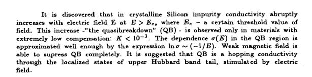 It is discovered that in crystalline Silicon impurity conductivity abruptly increases with electric field Б at Ε > ECt where Ec a certain threshold value of field. This increase -"the quasibreakdown" (QB) is observed only in materials with extremely low compensation: К < 10~3. The dependence <r(E) in the QB region is approximated well enough by the expression \χισ ( —Weak magnetic field is able to supress QB completely. It is suggested that QB is a hopping conductivity through the localized states of upper Hubbard band tail, stimulated by electric field.