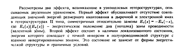 Рассмотрены два эффекта, возникающие в узкощелевых гетероструктурах, описываемых двузонным уравнением. Первый эффект обуславливает отсутствие совпадающих значений энергий размерного квантования в дырочной и электронной ямах в гетероструктурах II типа, симметричных относительно замены Ec{z) — — Еъ(—ζ), где Ec(z)(Ev(z)) энергетическое положение дна (потолка) зоны проводимости (валентной зоны). Второй эффект состоит в наличии локализованного состояния, энергия которого совпадает с точкой инверсии в полупроводниковой структуре с взаимно инвертированными зонами. Это состояние не зависит от формы энергетической структуры и граничных условий.