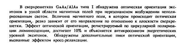 В сверхрешетках GaAs/AlAs типа I обнаружена оптическая ориентация экс-итонов в узкой области магнитных полей при нерезонансном возбуждении неполя-ризованным светом. Величина магнитного поля, в котором происходит оптическая ориентация^, резко зависит от его направления по отношению к плоскости сверхрешетки. Эффект оптической ориентации, регистрируемый по циркулярной поляризации люминесценции, достигает 10% и объясняется антикроссингом энергетических уровней экситонов. Обнаружены дополнительные пики оптической ориентации, вызванные эффектом кросс-релаксации.