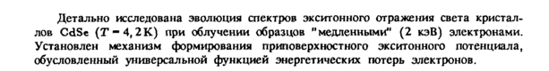 Детально исследована эволюция спектров экситонного отражения света кристаллов CdSc (Τ-4,2К) при облучении образцов "медленными" (2 кэВ) электронами. Установлен механизм формирования приповерхностного экситонного потенциала, обусловленный универсальной функцией энергетических потерь электронов.