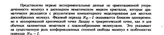 Представлены первые экспериментальные данные по ориентационной упорядоченности молекул в дискоидном нематическом жидком кристалле, которые драматически расходятся с результатами компьютерного моделирования для жестких дискообразных молекул. Фазовый переход Nq — I оказывается близким одновременно к изолированной критической точке Ландау и трикритической точке, как и для обычных каламитных нематиков с планкообразными молекулами. Это указывает на существенную роль конформационных степеней свободы молекул в особенностях перехода Nn — J.