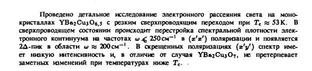 Проведено детальное исследование электронного рассеяния света на монокристаллах УВа2СизОб,5 с резким сверхпроводящим переходом при Тс « 53 К. В сверхпроводящем состоянии происходит перестройка спектральной плотности электронного континуума на частотах ω ^ 250см-1 в (χ'χ') поляризации и появляется 2А-пик в области ω и 200см"*"1. В скрещенных поляризациях (х'у1) спектр имеет низкую интенсивность и, в отличие от случая УВагСизОу, не претерпевает заметных изменений при температурах ниже Гс.