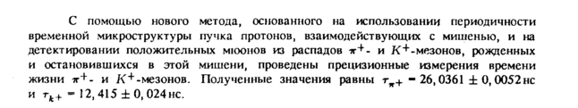 С помощью нового метода, основанного на использовании периодичности временной микроструктуры пучка протонов, взаимодействующих с мишенью, и на детектировании положительных мюонов из распадов ir+и К+-мезонов, рожденных и остановившихся в этой мишени, проведены прецизионные измерения времени жизни 7г+и К+-мезонов. Полученные значения равны τπ+ 26,0361 ± 0,0052нс и тк+ 12, 415 ± 0,024 нс.