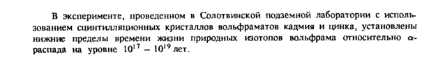 В эксперименте, проведенном в Солотвинской подземной лаборатории с использованием сцинтилляционных кристаллов вольфраматов кадмия и цинка, установлены нижние пределы времени жизни природных изотопов вольфрама относительно а-распада на уровне 1017 — 1019лет.