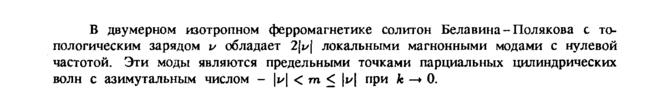 В двумерном изотропном ферромагнетике солитон Белавина-Полякова с топологическим зарядом и обладает 2\и\ локальными магнонными модами с нулевой частотой. Эти моды являются предельными точками парциальных цилиндрических волн с азимутальным числом \v\ < m < \v\ при к —► 0.