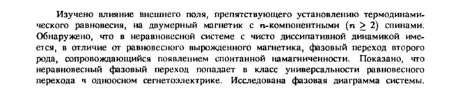 Изучено влияние внешнего поля, препятствующего установлению термодинамического равновесия, на двумерный магнетик с η-компонентными (п > 2) спинами. Обнаружено, что в неравновесной системе с чисто диссипативной динамикой имеется, в отличие от равновесного вырожденного магнетика, фазовый переход второго рода, сопровождающийся появлением спонтанной намагниченности. Показано, что неравновесный фазовый переход попадает в класс универсальности равновесного перехода ч одноосном сегнетоэлектрике. Исследована фазовая диаграмма системы.