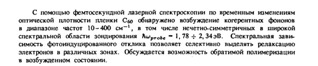 С помощью фемтосекундной лазерной спектроскопии по временным изменениям оптической плотности пленки Сбо обнаружено возбуждение когерентных фононов в диапазоне частот 10-400 см-1, в том числе нечетно-симметричных в широкой спектральной области зондирования ки>ртоье ш I, 78 -f 2, 34эВ. Спектральная зависимость фотоиндуцированного отклика позволяет селективно выделять релаксацию электронов в различных зонах. Обсуждается возможность обратимой полимеризации в возбужденном состоянии.