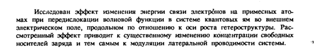 Исследован эффект изменения энергии связи электронов на примесных атомах при передислокации волновой функции в системе квантовых ям во внешнем электрическом поле, продольном по отношению к оси роста гетероструктуры. Рассмотренный эффект приводит к существенному изменению концентрации свободных носителей заряда и тем самым к модуляции латеральной проводимости системы.
