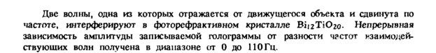 Две волны, одна из которых отражается от движущегося объекта и сдвинута по частоте, интерферируют в фоторефрактивном кристалле В^гТЮгоНепрерывная зависимость амплитуды записываемой голограммы от разности частот взаимодействующих волн получена в диапазоне от 0 до ПО Гц.